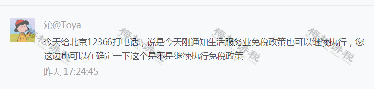 但有個(gè)粉絲朋友留言:打電話問過12366,給的答復(fù)是生活服務(wù)業(yè)免征政策可以繼續(xù)執(zhí)行。