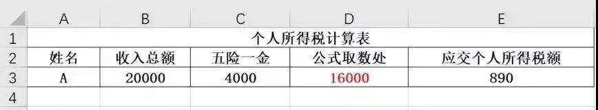 批量計(jì)算怎么辦?別發(fā)愁,我們有excel快捷公式奉上,還是剛才的例子,用A個(gè)人收入20000元,再減去五險(xiǎn)一金4000元,求得16000元,填寫在表格D3處: